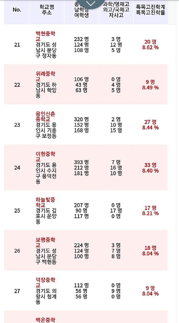 2019년 중학교 입결위례중이 위례내에서 1등(서울은 자사고 추쳠제라 사실상 성적과 상관없고 미달도 많아 원서만 내면 들어가는 자사고 포함한 순위는 형평성이 없음) 경기도에서 지원가능한 광역자사고는 성적순이고 들어가기 매우 힘들어 외고나 국제고와 비슷한 수준위례중 총원 106명에 9명한빛중 총원 140명에 6명송례중은 추첨제 자사고 빼면 총원 238명에 4명 진학위례중앙중 총원 67명에 2명임