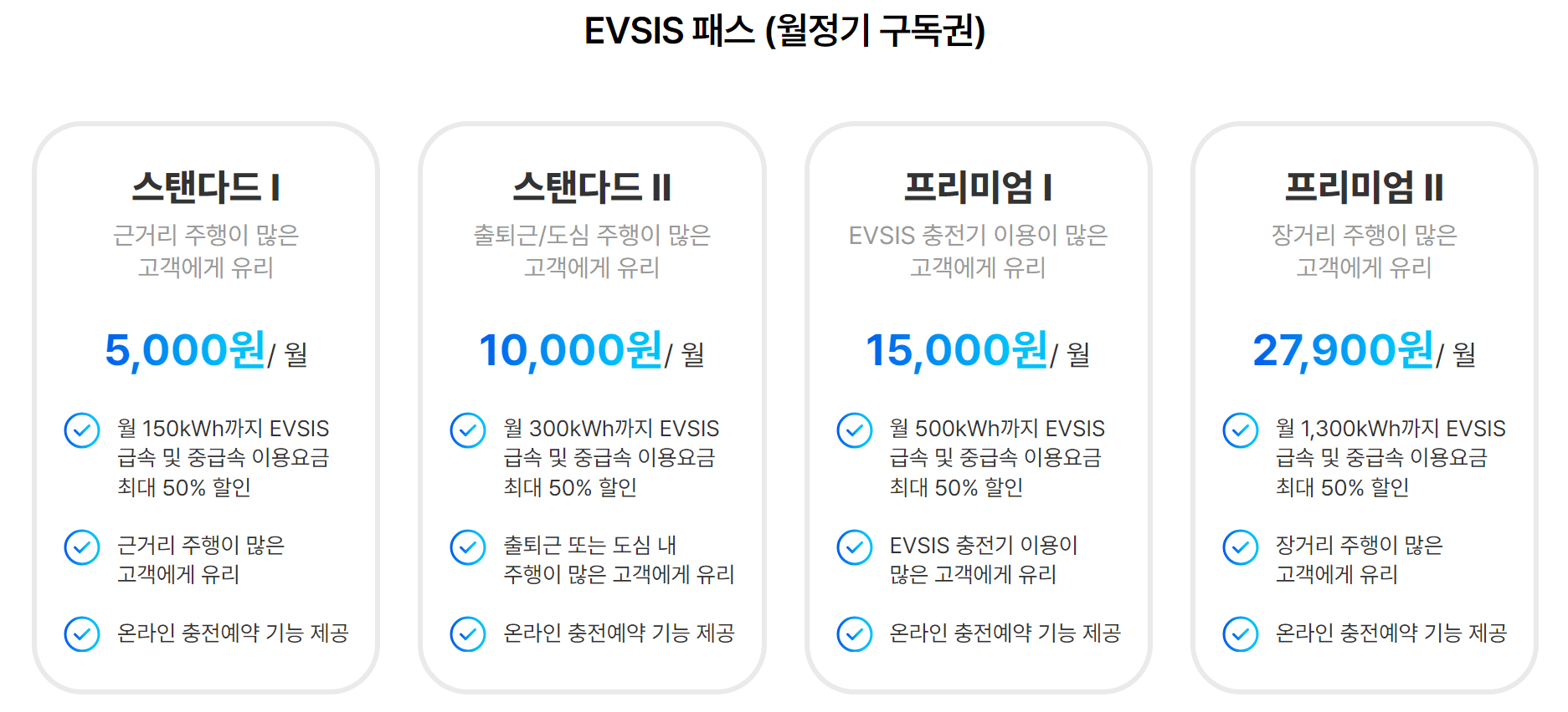 패스 가격은 5천원에서 부터 27,900월 까지 할인 충전 용량은 월 1일에서 말일 기준 150kw에서 1,300kwh입니다.